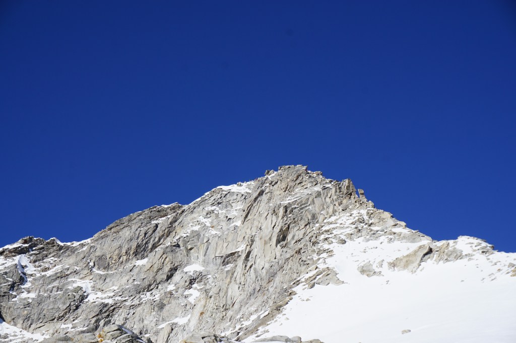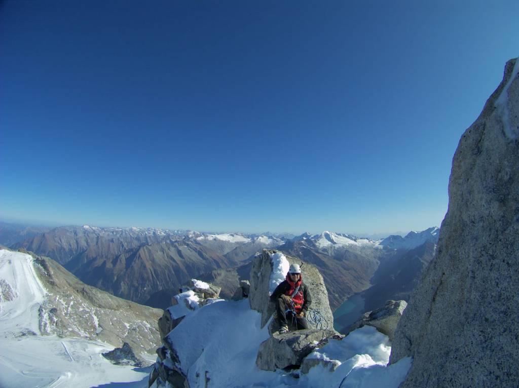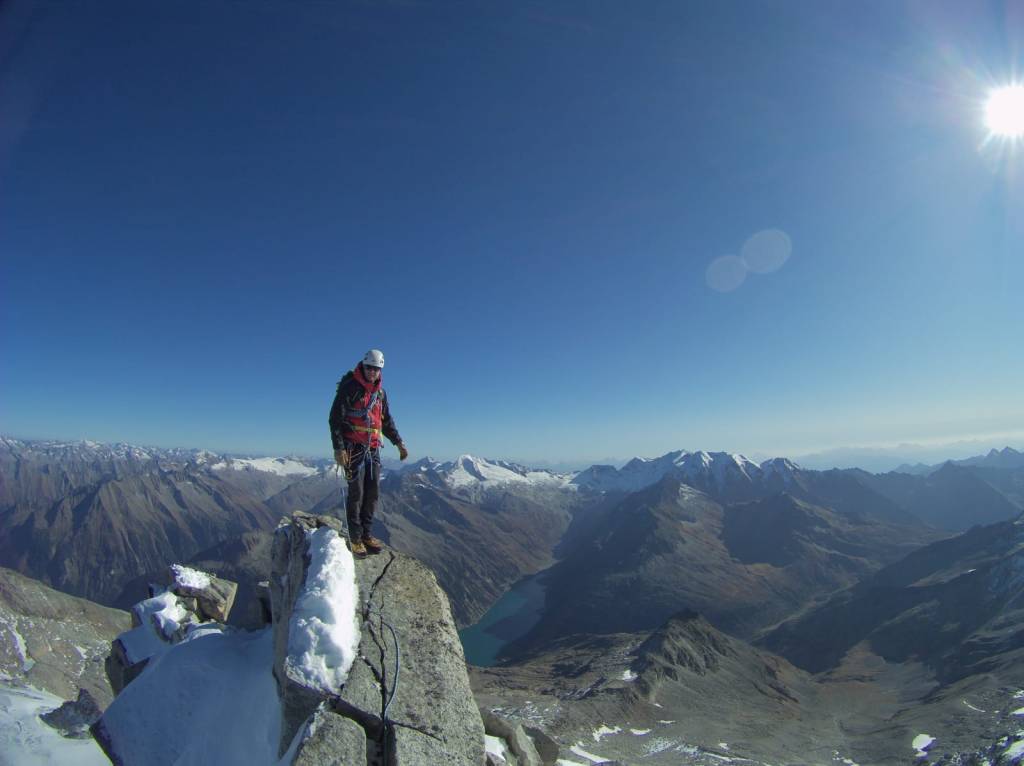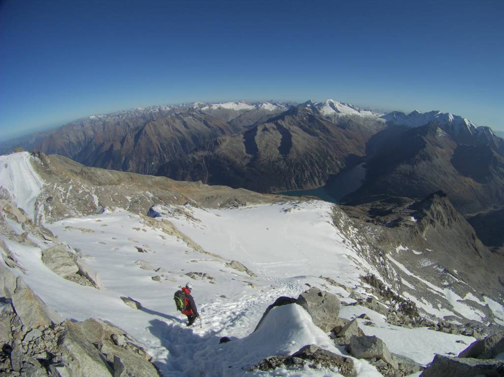 Samstag bei herrlichem Wetter ging es bei recht einfacher Wegfindung Richtung Gipfel, der von der Südseite gar nicht so spektakulär wirkt. Über schönes Blockgelände ging es bis auf ca. 3100m bis zum Gletscher/Schneefeld, aufgrund der guten Schneelage ging alles ohne Steigeisen zu gehen. Um auf den eigentlichen Grat zu kommen hilft ein kurzer Klettersteig B/C vielleicht eine kurze Stelle C. Durch die leicht winterlichen Verhältnisse entschieden wir uns den Grat am laufenden Seil zu gehen, man findet auch immer wieder gute Sicherungspunkte und Bohrhaken was eine soliden Sicherungspunkt bietet.