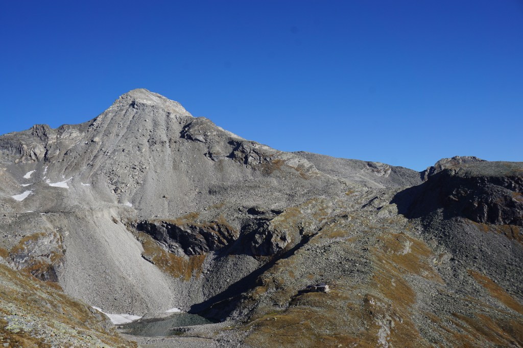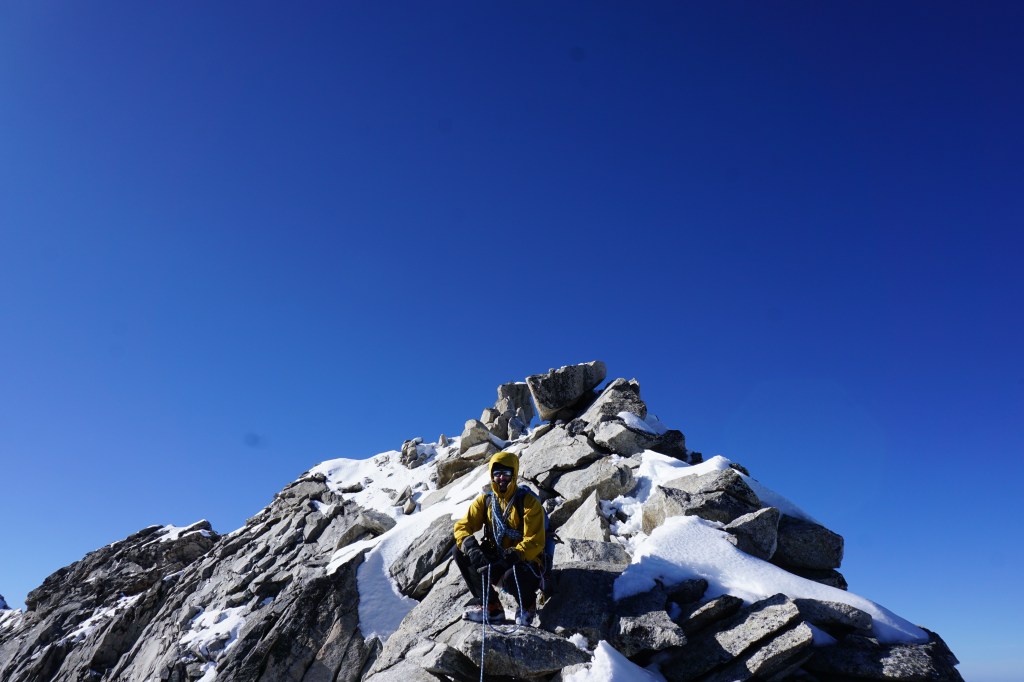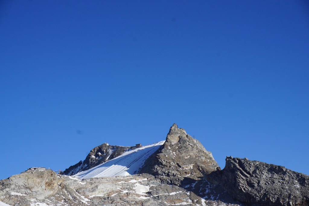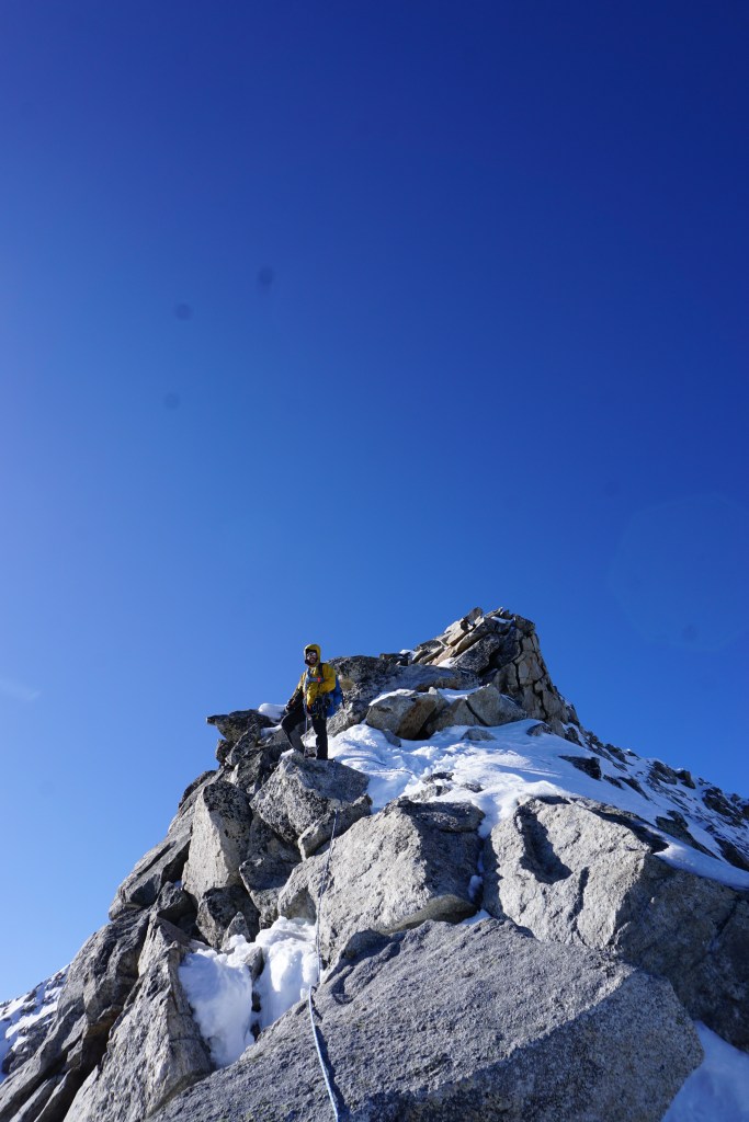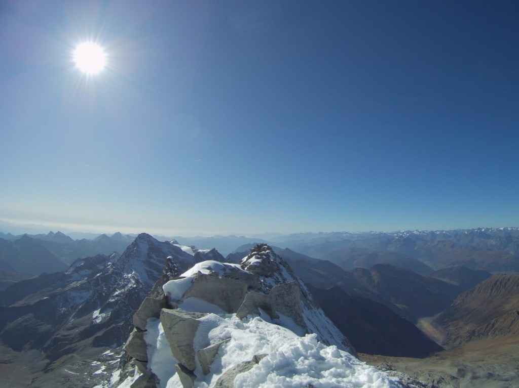 Samstag bei herrlichem Wetter ging es bei recht einfacher Wegfindung Richtung Gipfel, der von der Südseite gar nicht so spektakulär wirkt. Über schönes Blockgelände ging es bis auf ca. 3100m bis zum Gletscher/Schneefeld, aufgrund der guten Schneelage ging alles ohne Steigeisen zu gehen. Um auf den eigentlichen Grat zu kommen hilft ein kurzer Klettersteig B/C vielleicht eine kurze Stelle C. Durch die leicht winterlichen Verhältnisse entschieden wir uns den Grat am laufenden Seil zu gehen, man findet auch immer wieder gute Sicherungspunkte und Bohrhaken was eine soliden Sicherungspunkt bietet.